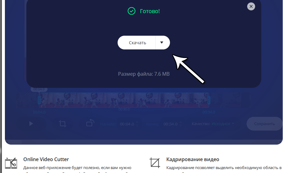 Шаг второй: Ползунками слева и справа под видео выставьте время начала и окончания таким образом, чтобы общее время ролика не превышало 30 секунд, затем нажмите "Сохранить" справа внизу. Обработка займет совсем немного времени.